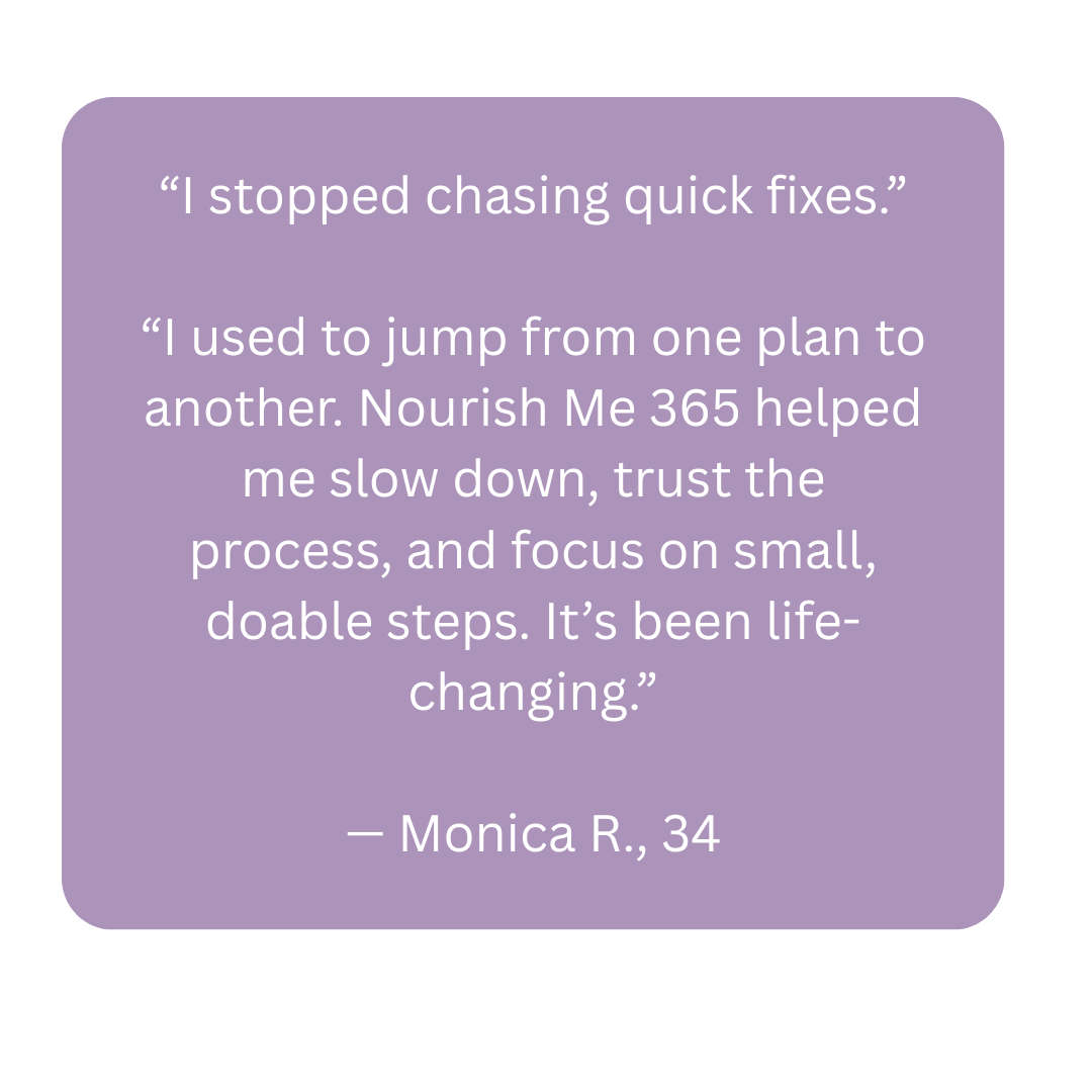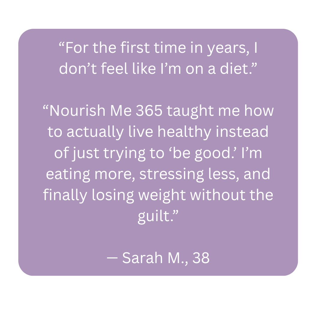 Because it's not a "diet". The Nourish Me 365 Lifestyle System is a framework for real life. Most programs tell you to change everything overnight. This one meets you where you're at and helps you make small, consistent shifts that naturally fit into your routine over time...so they last. It's all about making progress (not perfection) and transforming your habits, mindset, and confidence from the inside out.