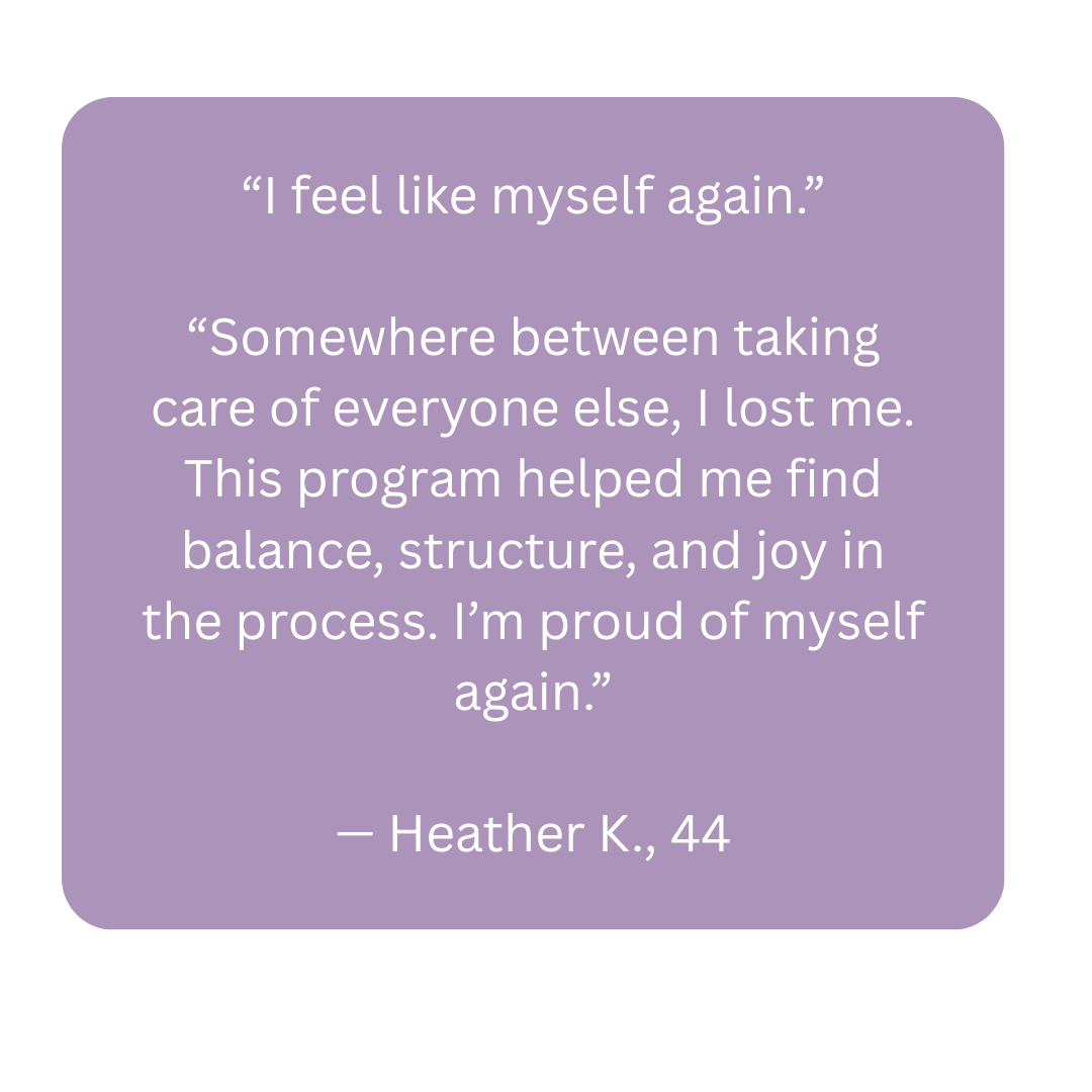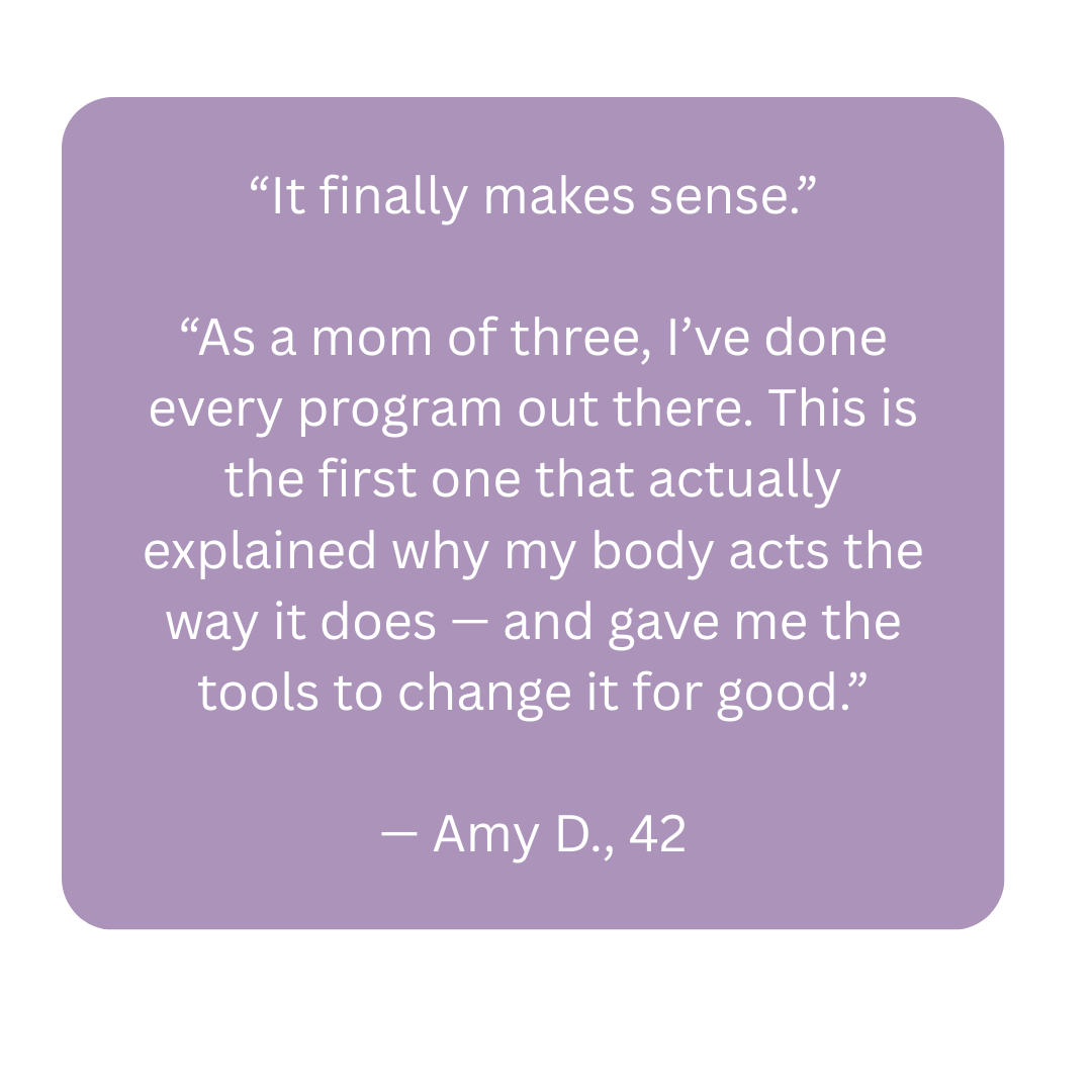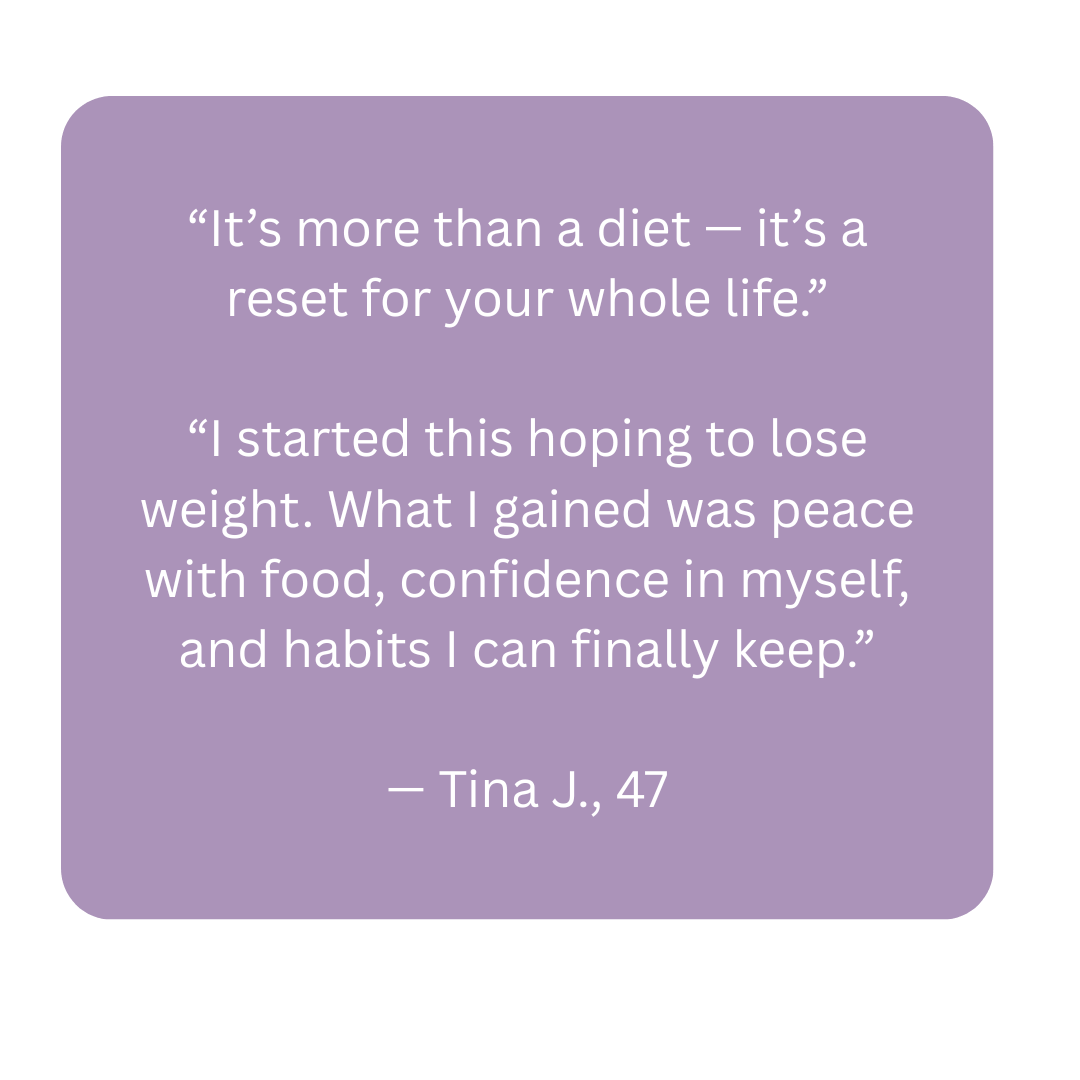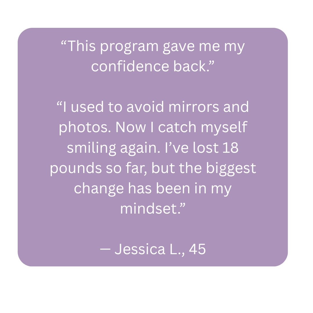 You know exactly what to eat - no counting, no confusion, no guilt. You actually like the way you're eating because it tastes good, fits your life, and feels doable. You look in the mirror and see progress - not just in your body, but in your confidence. You finally feel in control again.
