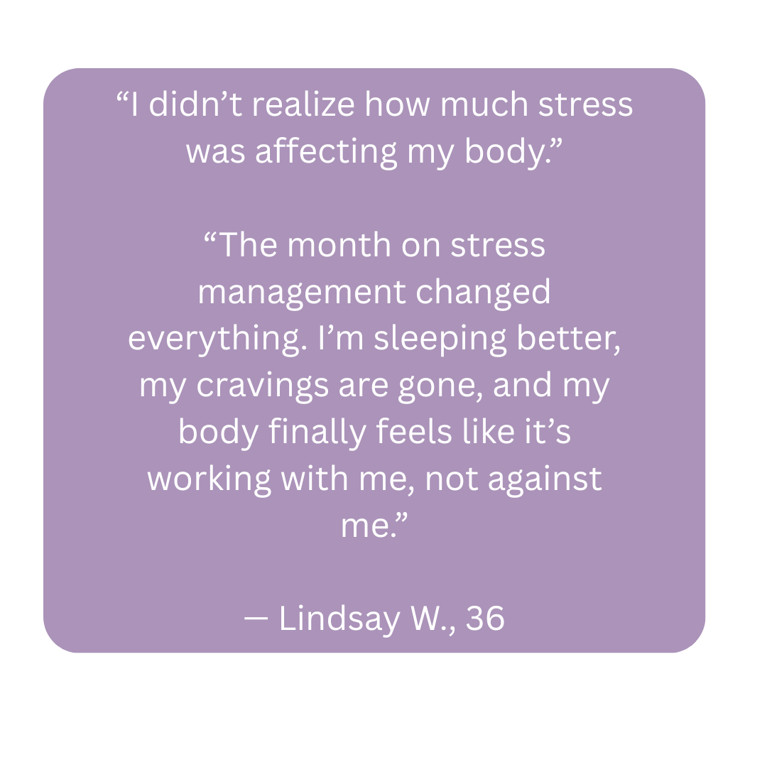 Each month focuses on only one key area of transformation- like stress, metabolism, or building good habits- so it never feels overwhelming. You'll typically spend just a few minutes a day reading, reflecting, or logging your progress and incorporating what you are learning into actual practice. You may also want to do a little bit of simple meal prepping (chopping veggies, portioning snacks, etc.) once or twice a week as well. This system was designed for busy women who are juggling a lot but still want to make lasting change.
